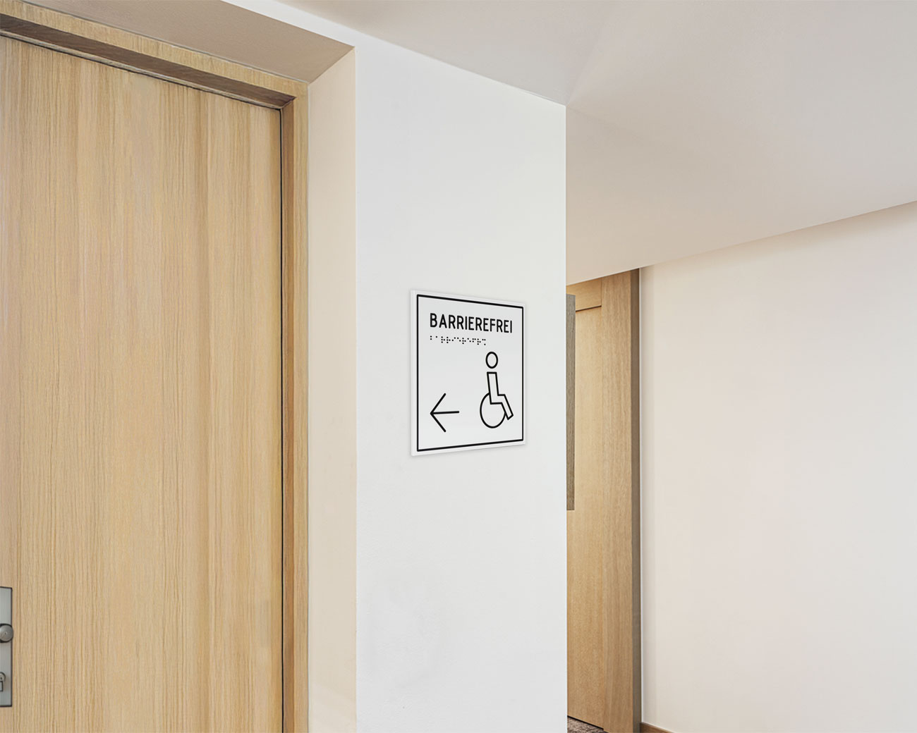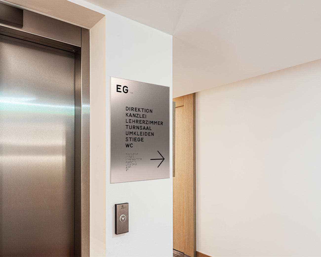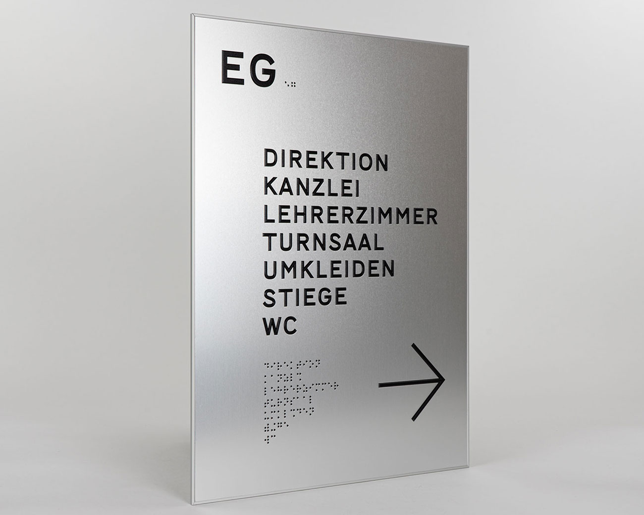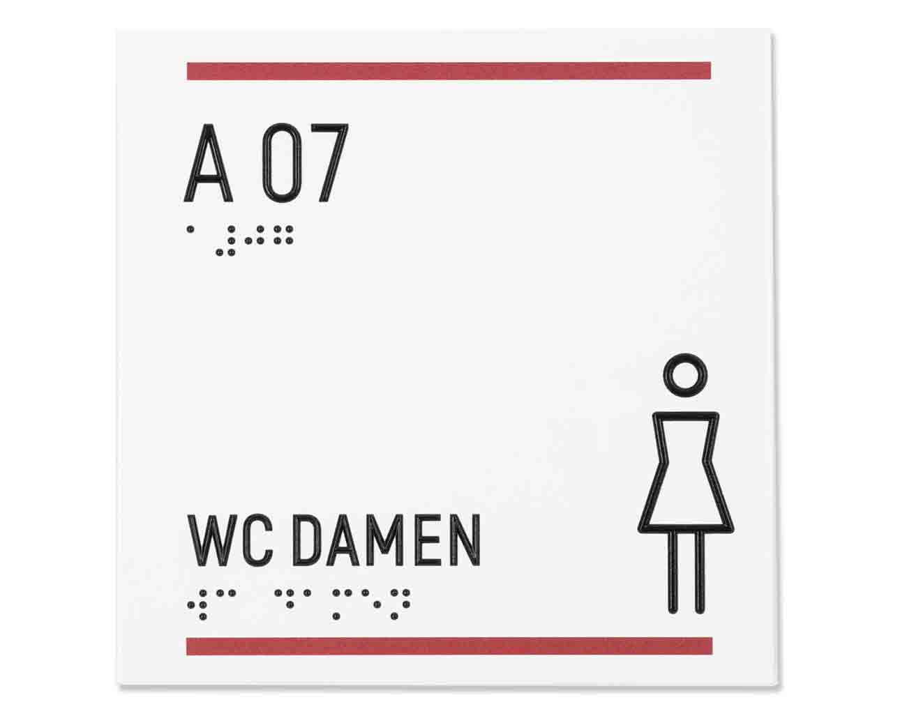 Taktile Schilder und Leitsysteme wie Türschilder, Handlaufschilder und Bodenleitlinien.
