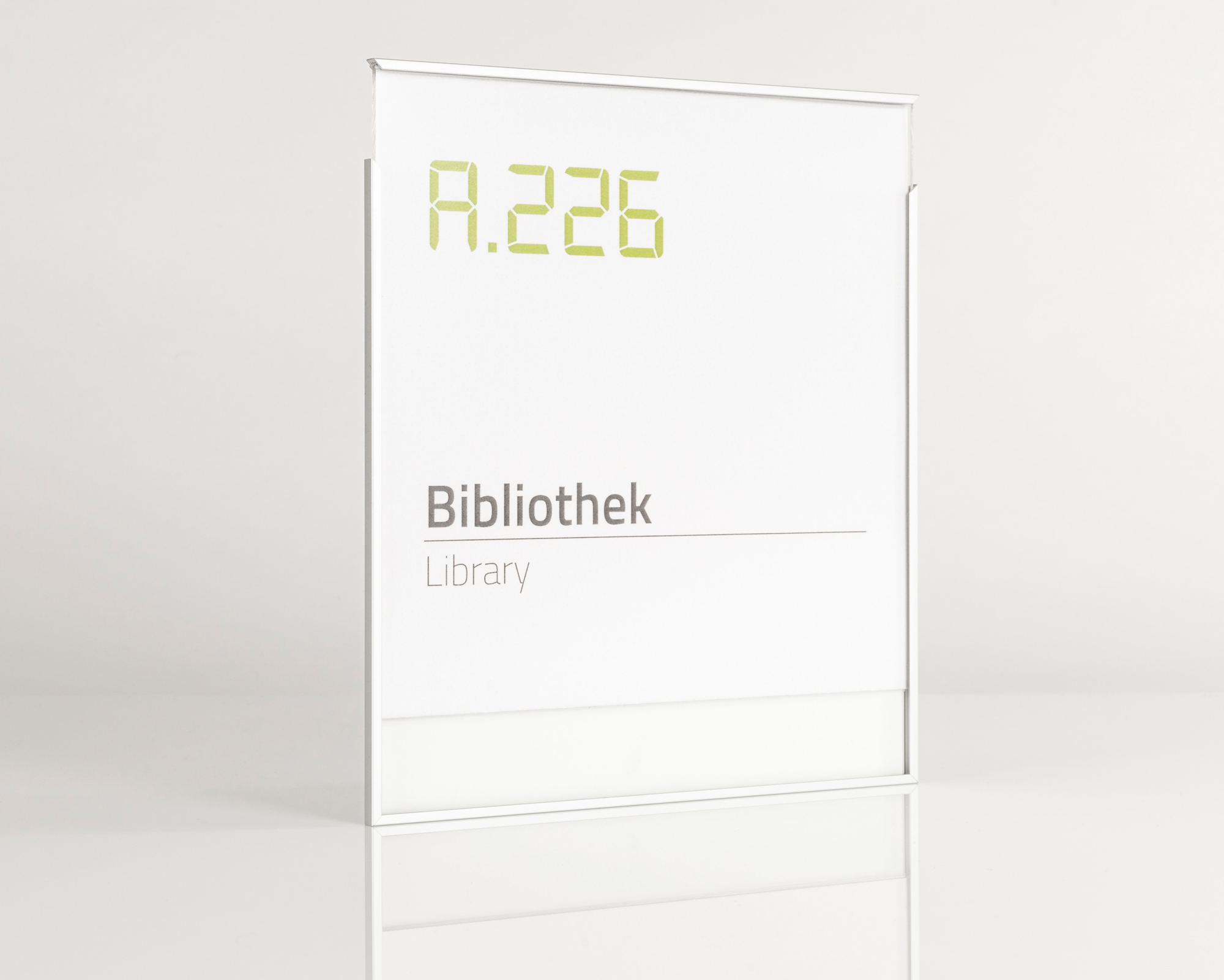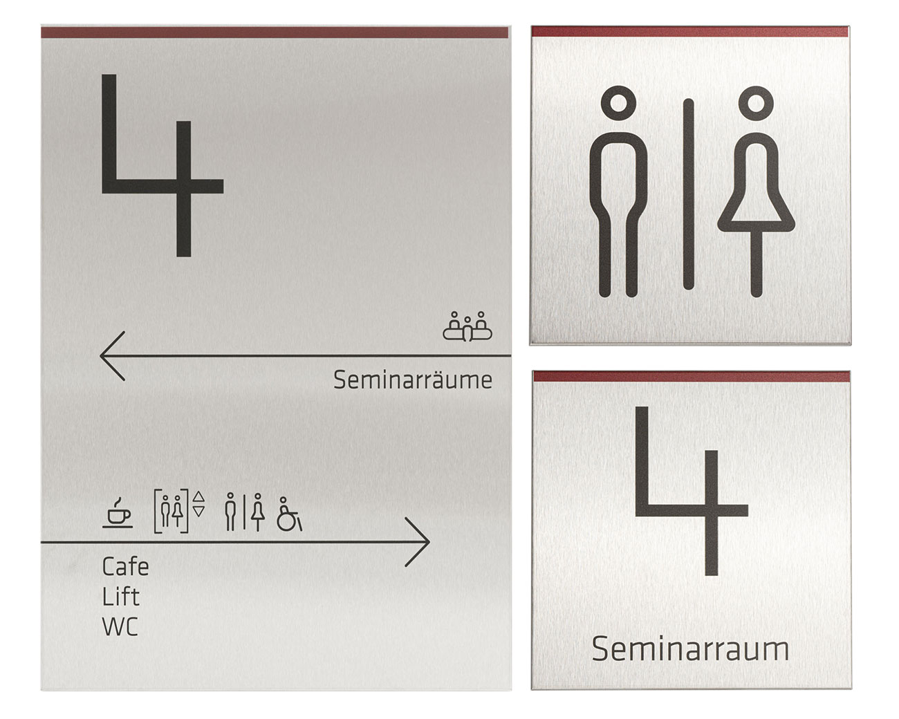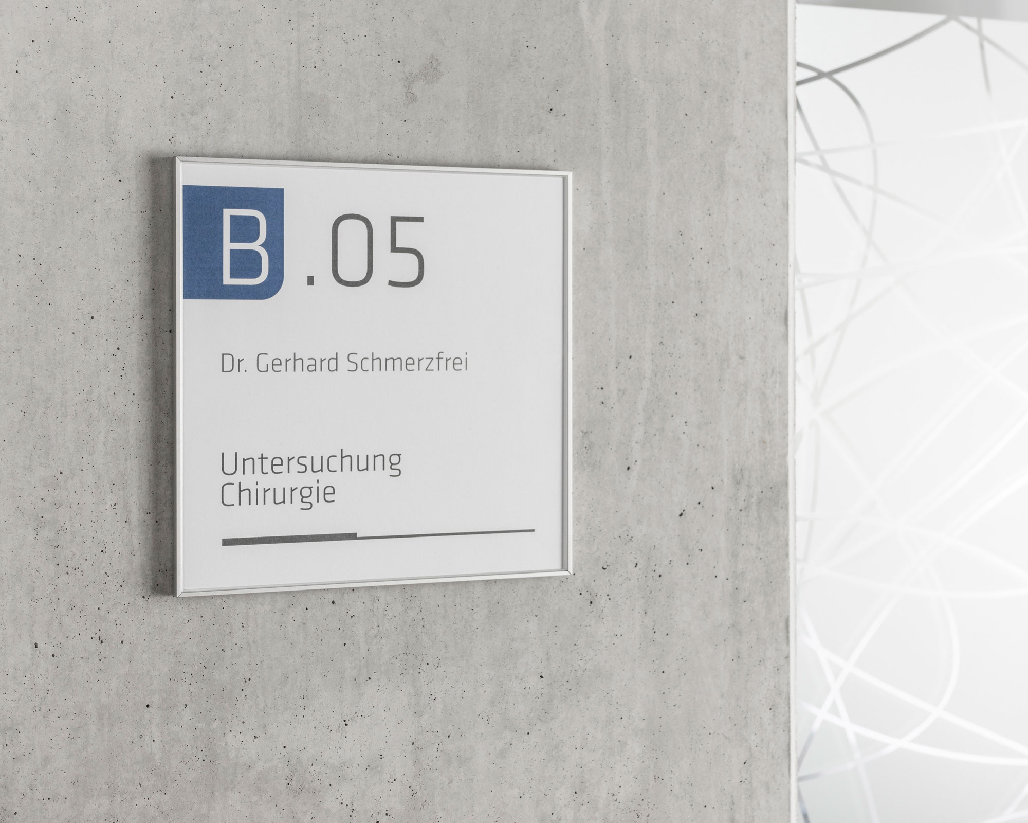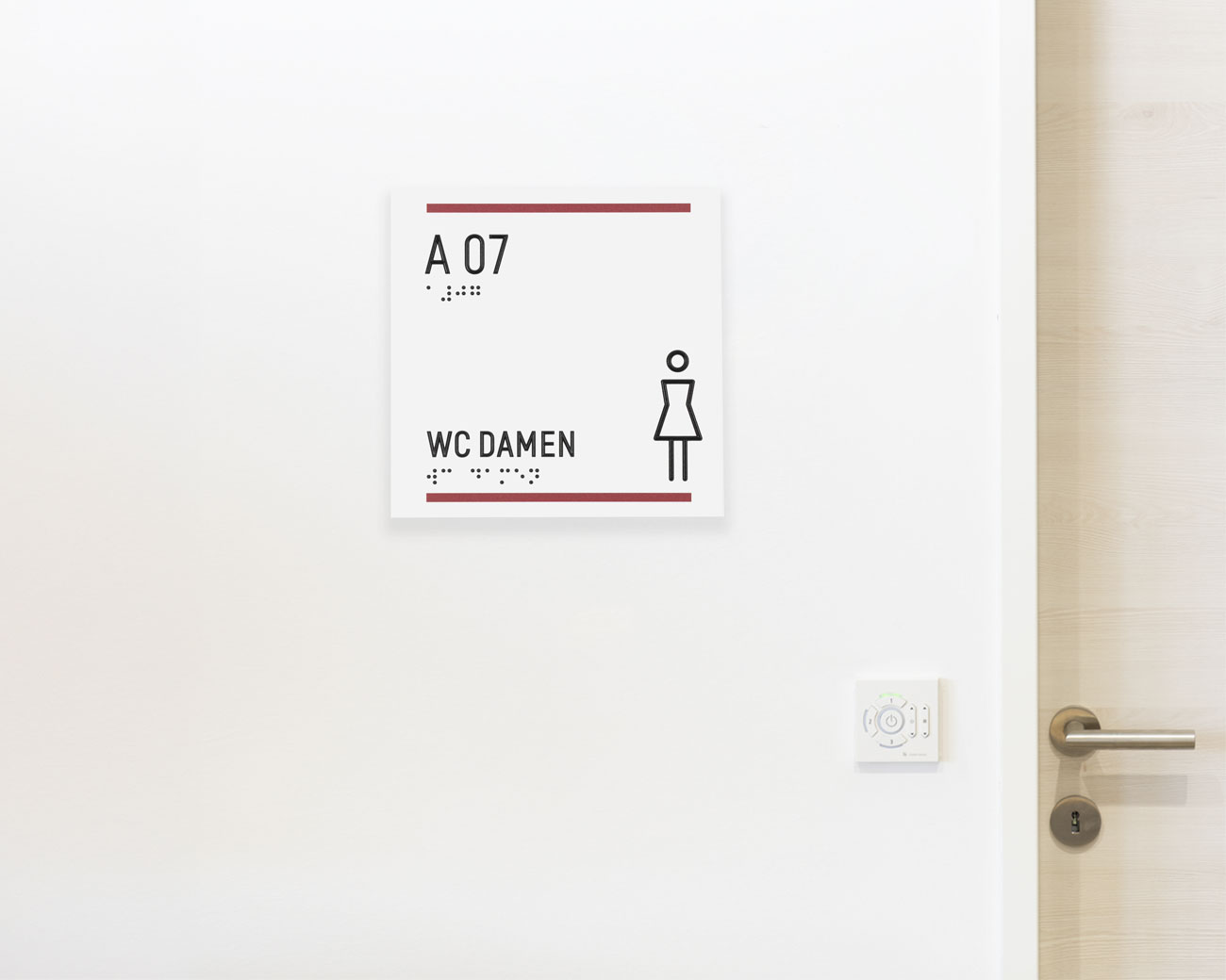 Taktile Schilder und Leitsysteme wie Türschilder, Handlaufschilder und Bodenleitlinien.